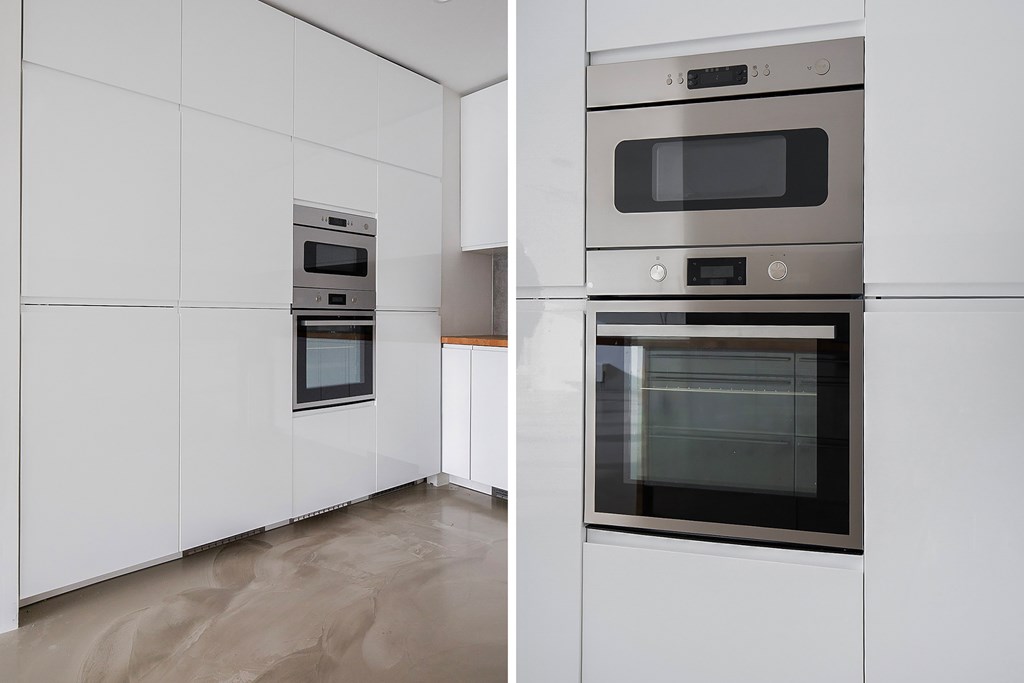 De open keuken is compleet uitgerust met alle wenselijke inbouwapparatuur en sluit naadloos aan op de leefruimte. Vanuit de woonkamer is er toegang tot de serre, die flexibel in te richten is als extra zitruimte, werkplek of speelruimte.