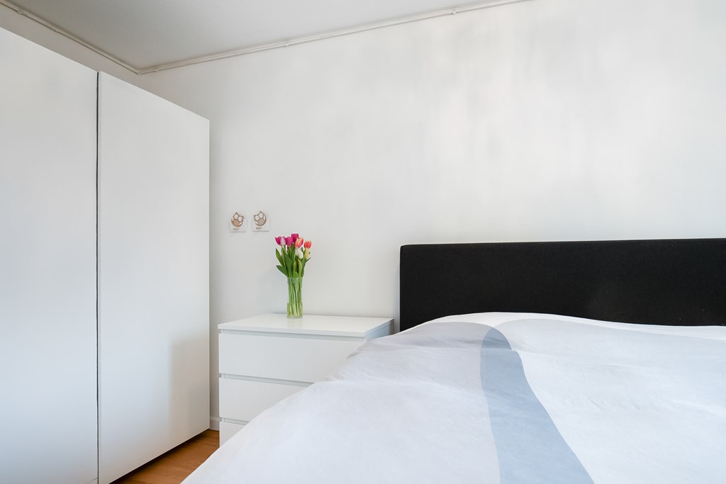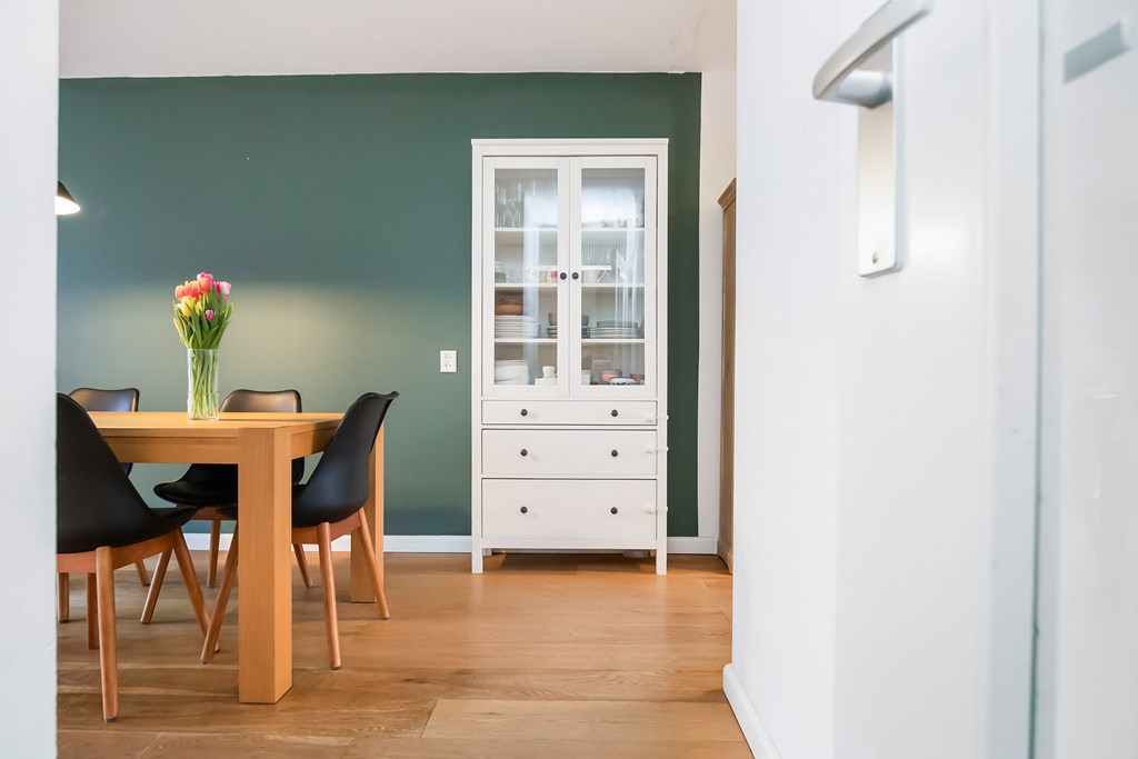 The spacious and bright living room extends across the full depth of the apartment and offers a pleasant layout with a centrally positioned dining area. At the front, there is a balcony where you can comfortably sit and relax.