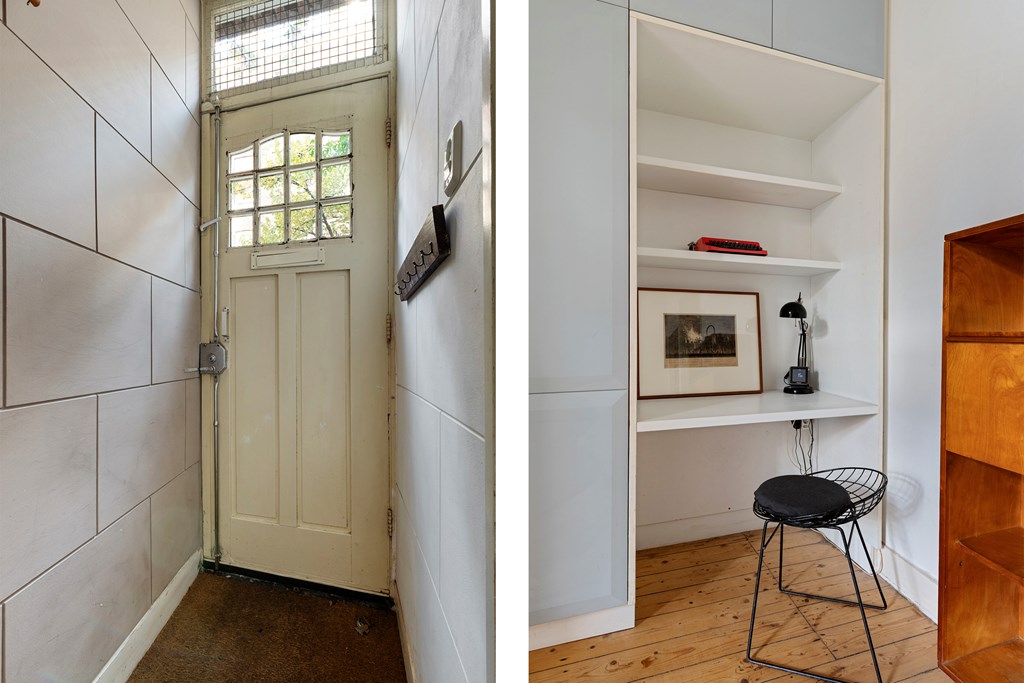 The private entrance from the street leads into the hallway, which provides access to the front room and bathroom.