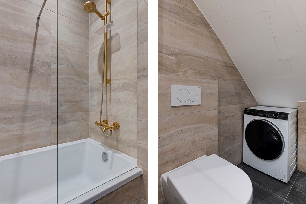 De badkamer is voorzien van een ligbad en toilet. Een sfeervolle glas-in-lood en-suite scheidt de voor- en woonkamer van elkaar. Aan de achterzijde bevinden zich de woonkamer, keuken en slaapkamer — allen met toegang tot de ruime tuin van circa 25 m², gelegen op het westen.